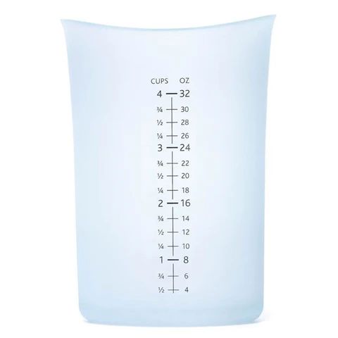 The 4 cup measure Flex~it design allows you to form a spout anywhere on the flexible rim. Pours liquids precisely with no spills. Exteriors is textured for a secure grip and interior is smooth for easy pouring. The silicone material grips the counter to provide traction and stability. Measurement level indicators are clear and easy to read. Quick read measurement lines are accurate for precise measuring. Microwave and dishwasher safe; heat resistant to 490°F. Clear silicone with black measurement markings. Also available as a set of 3 sizes.